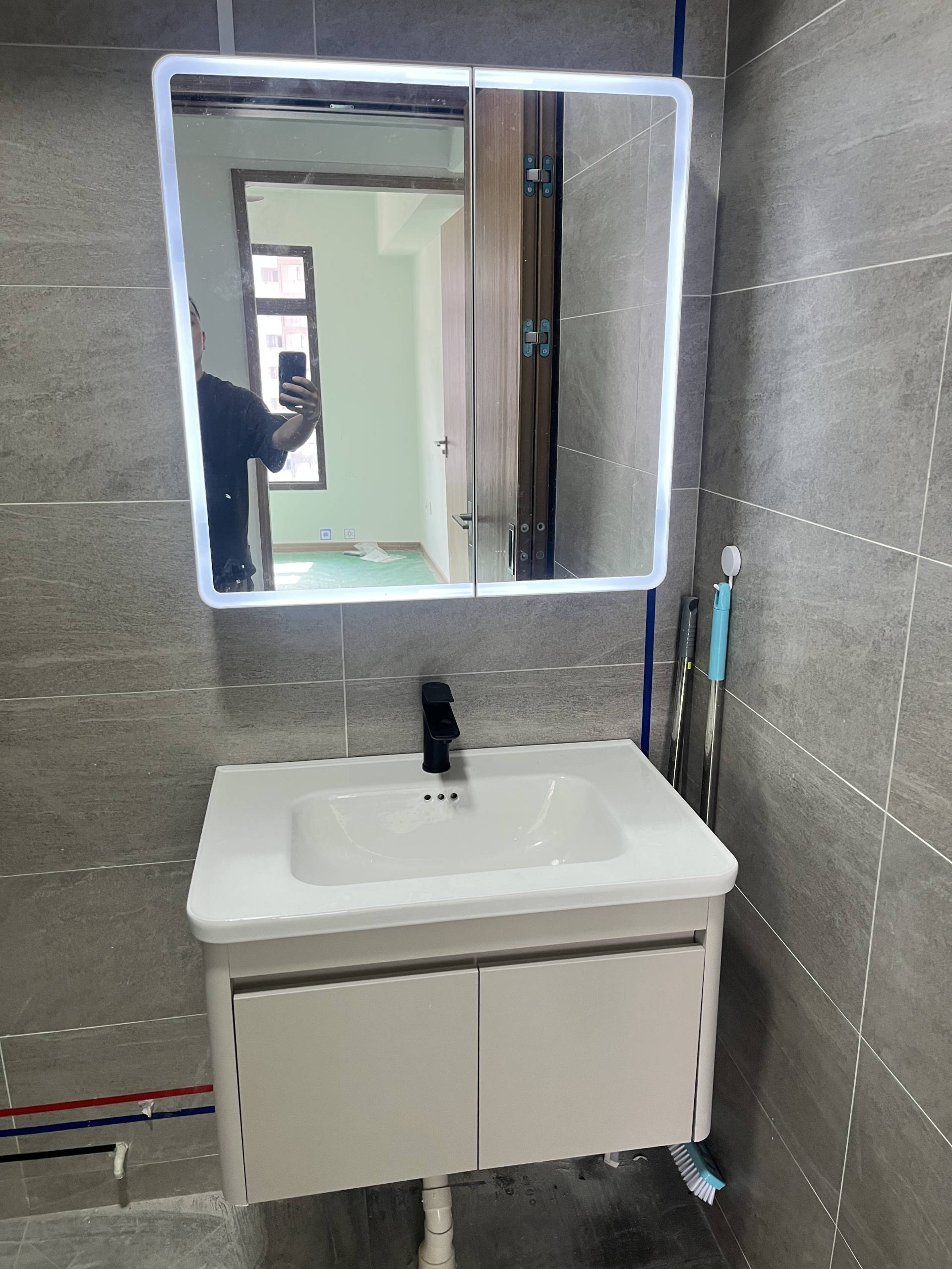 Compact vanity with solid-surface top and mirror storage maximises space while keeping the bathroom organised and hotel-clean.